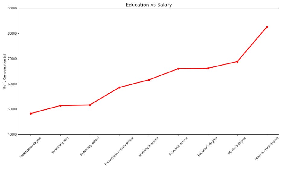 En la línea con lo anterior, crearíamos un DataFrame con la columna “formación” y “salario anual”. Lo agrupamos en función de la formación y le calculamos la media para cada grupo.